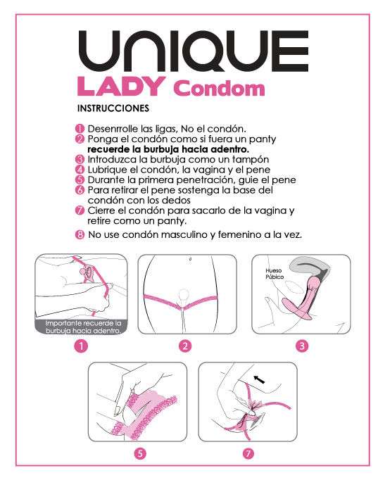 Preservativo femminile, lubrificato; Con bolle d’aria come meccanismo di ritenzione interno e delicate chiusure in pizzo che simulano giarrettiere. Molto facile e comodo da inserire.